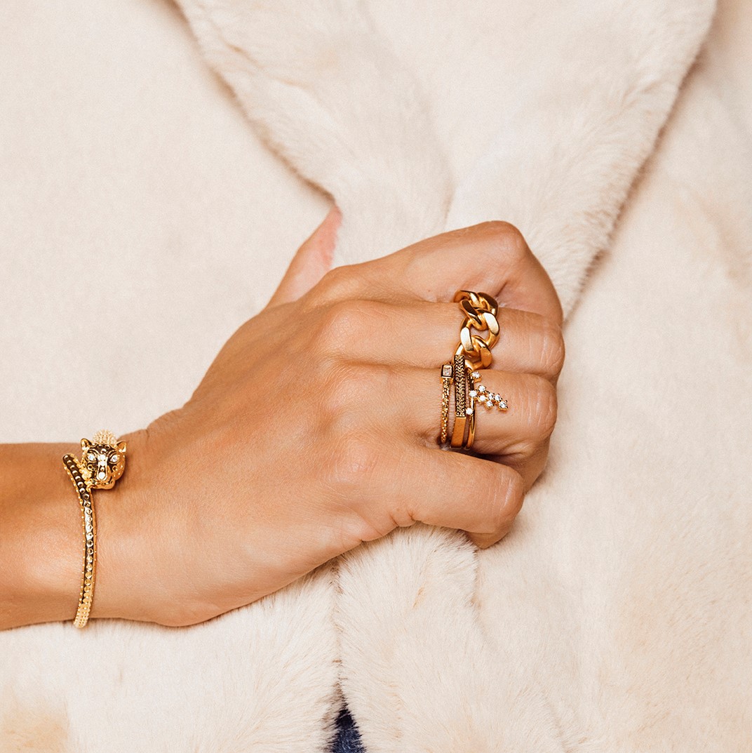 On agrandit l’assortiment de nos grosses mailles. En route pour les US avec PALM SPRINGS, NEVADA et SAN JOSE. Les mailles se glissent sur vos doigts avec un gros crush : la bague L.A. Le plaquage mat se mêle au brillant pour un mélange de textures dans chaque mix and match.